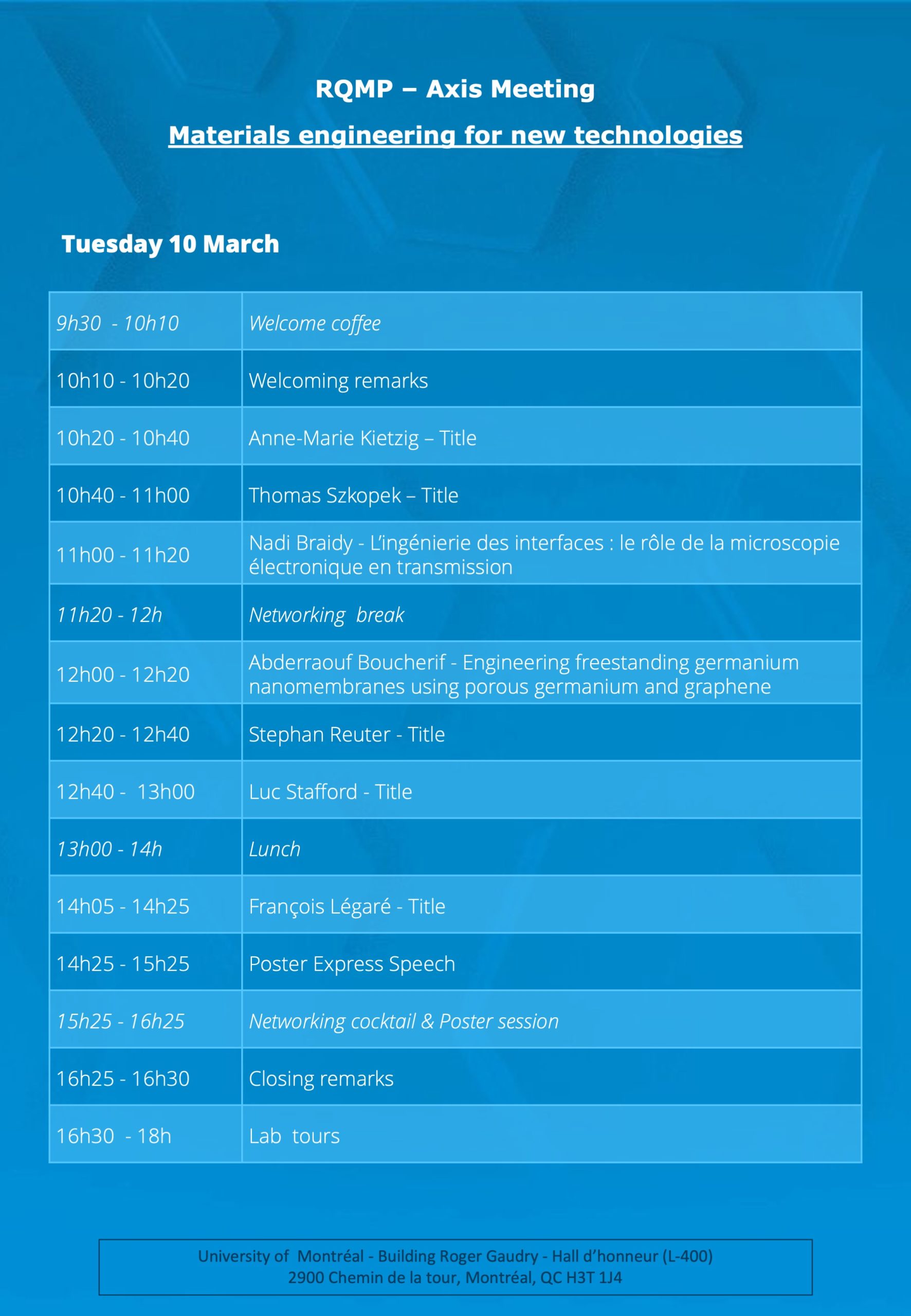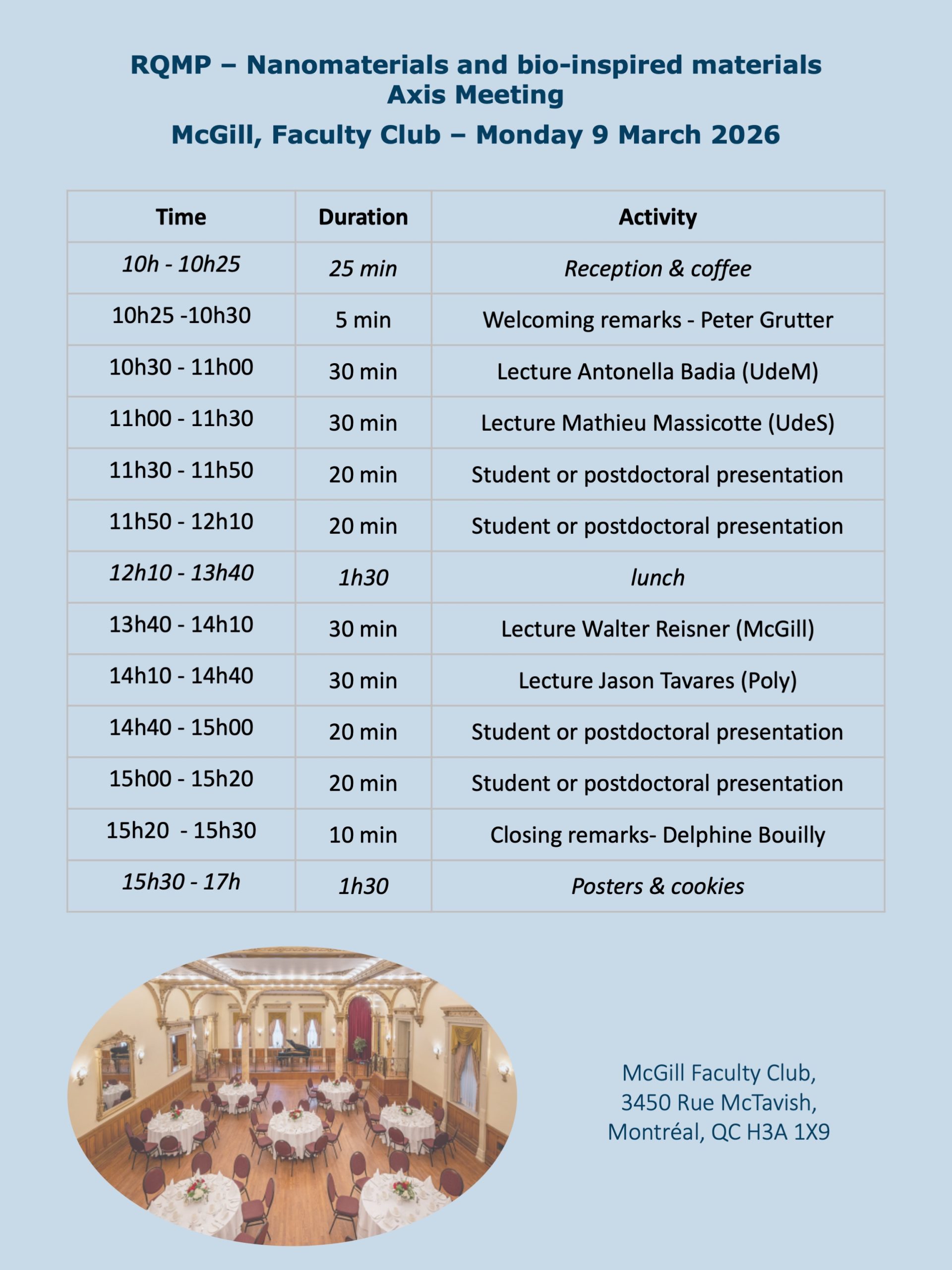 You are invited to the Nanomaterials and Biologically Inspired Materials Axis meeting on Monday, March 9, at McGill. Followed by the Materials for New Advanced Technologies axis on Tuesday, March 10, at the Université de Montréal.