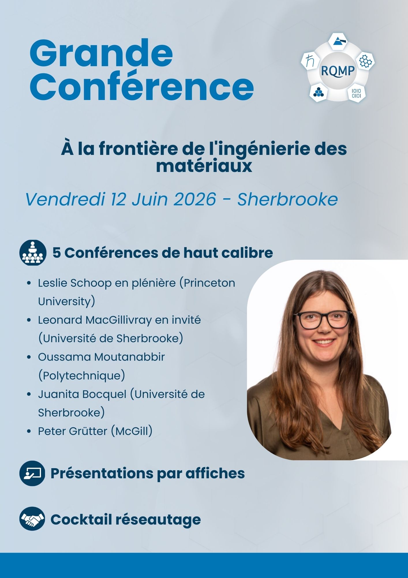 La Grande conférence du RQMP est le rassemblement annuel de tous nos membres et collaborateurs. L’occasion de discuter sciences des matériaux, entretenir les collaborations, et célébrer toutes les réussites de nos membres.
