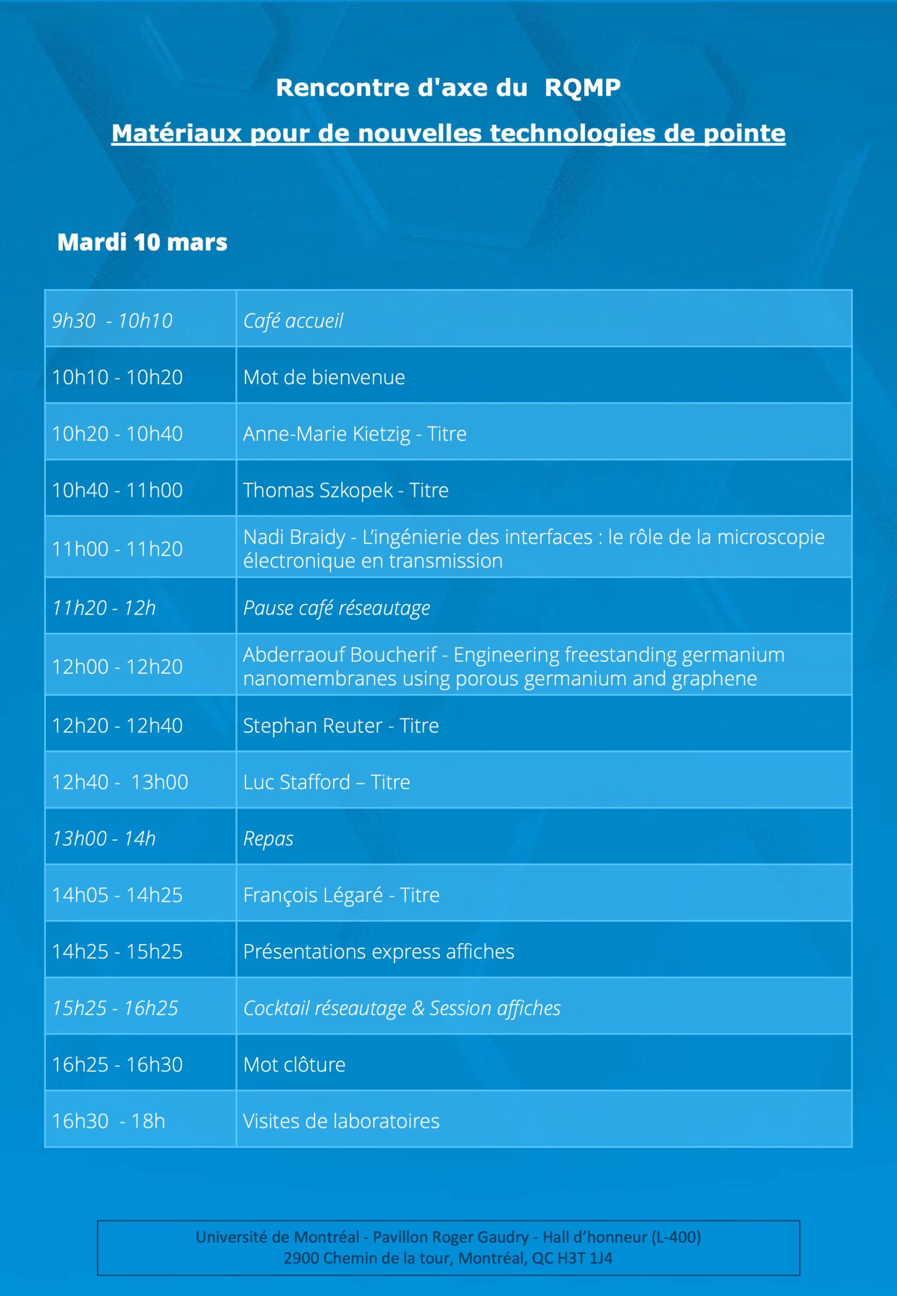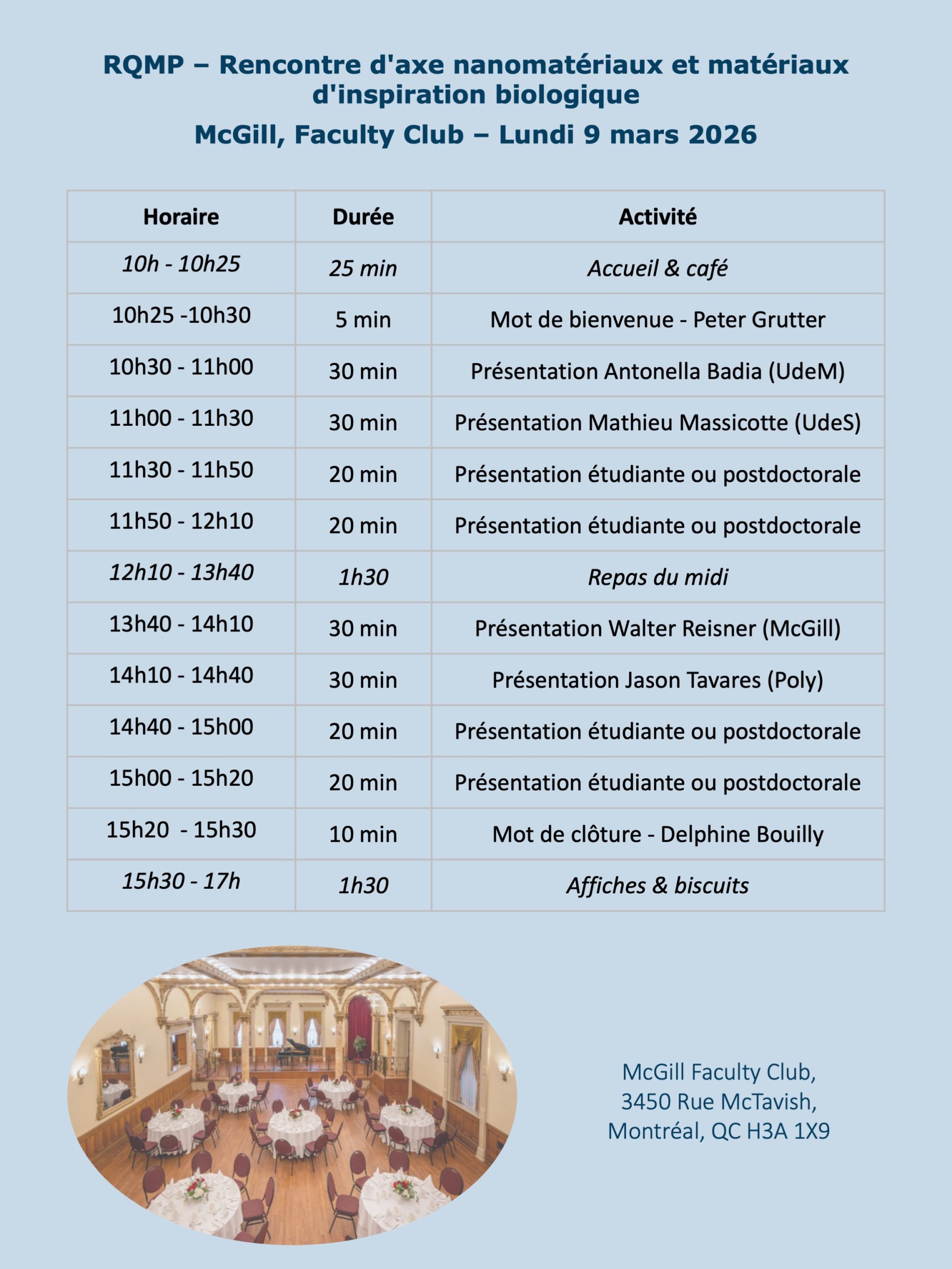 Vous êtes donc conviés à la rencontre d’axe nanomatériaux et matériaux d’inspiration biologique le lundi 9 mars, à McGill. Suivi de l’axe Matériaux pour de nouvelles technologies de pointe le mardi 10 mars, à l’Université de Montréal.